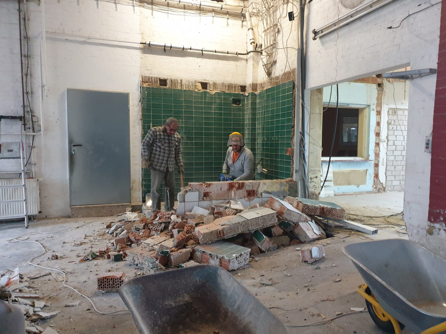 Eine weitere tragende Wand wird abgerissen um den Bereich der Rösterei fertig umzubauen. Um den Backstein mehr Raum zugeben, haben wir uns entschlossen die alten Steine von 1907 mithilfe der Sandtrahltechnik von weißer Farbe zu befreien. Zum Vorschein kommt der charakteristische gelb-rot bunte Backstein der alten Feuerwache.